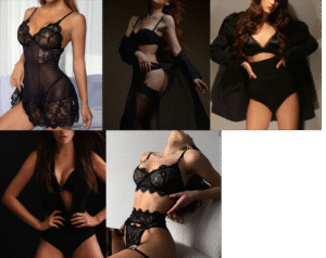 Voorbeelden: body harnesses, babydolls, hotpants, kimono, leer, kant of lak.